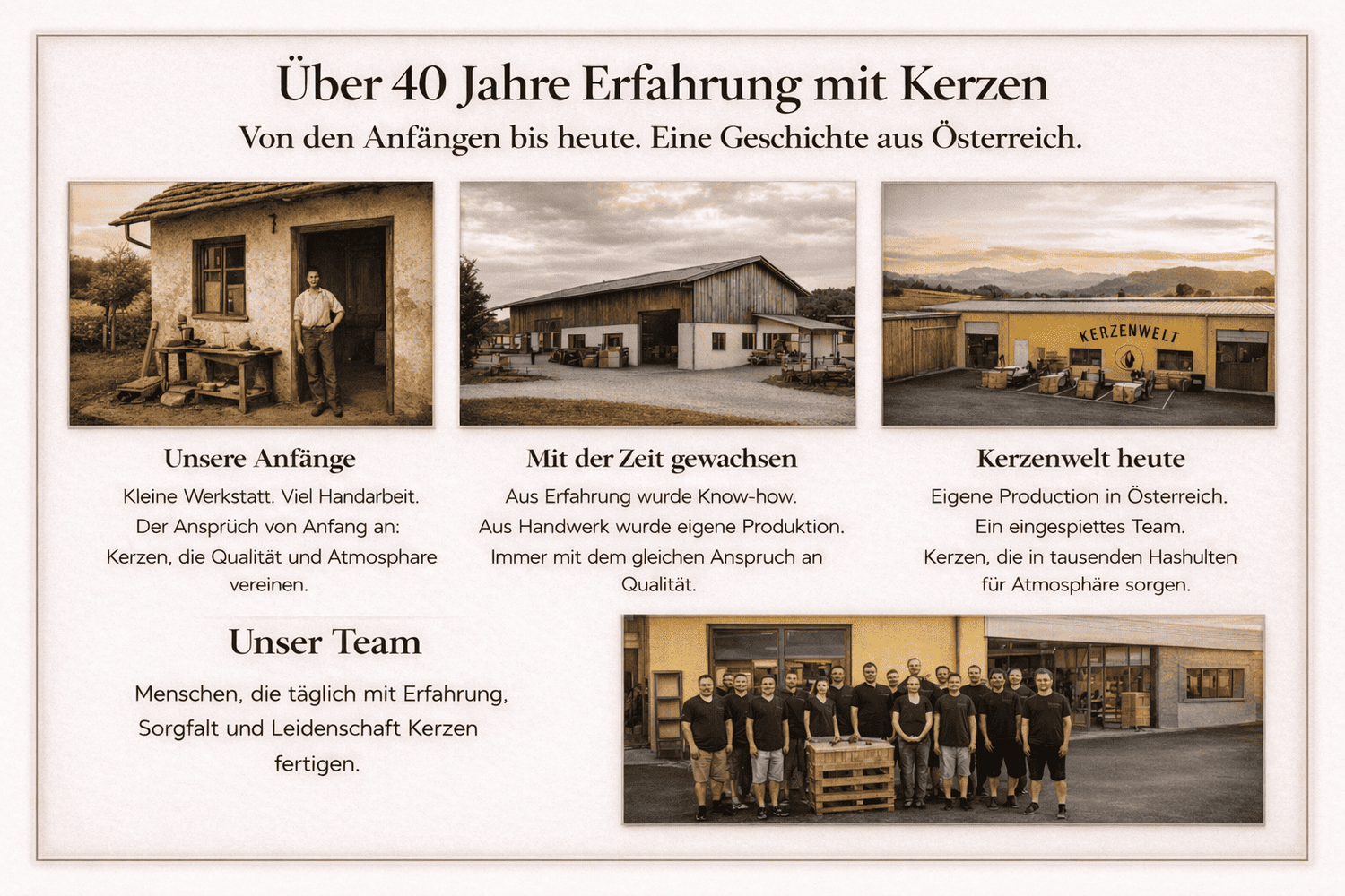 Seit über 40 Jahren arbeiten wir täglich mit Licht, Farbe und Atmosphäre. Dieses Wissen steckt in jeder Kerze – von der Wachsmischung bis zum gleichmäßigen Abbrand. Erfahrung, die man sieht und spürt.